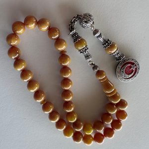 sistem püsküllü , tamamı tek parça renk almış eski sıkma kehribar tesbih.